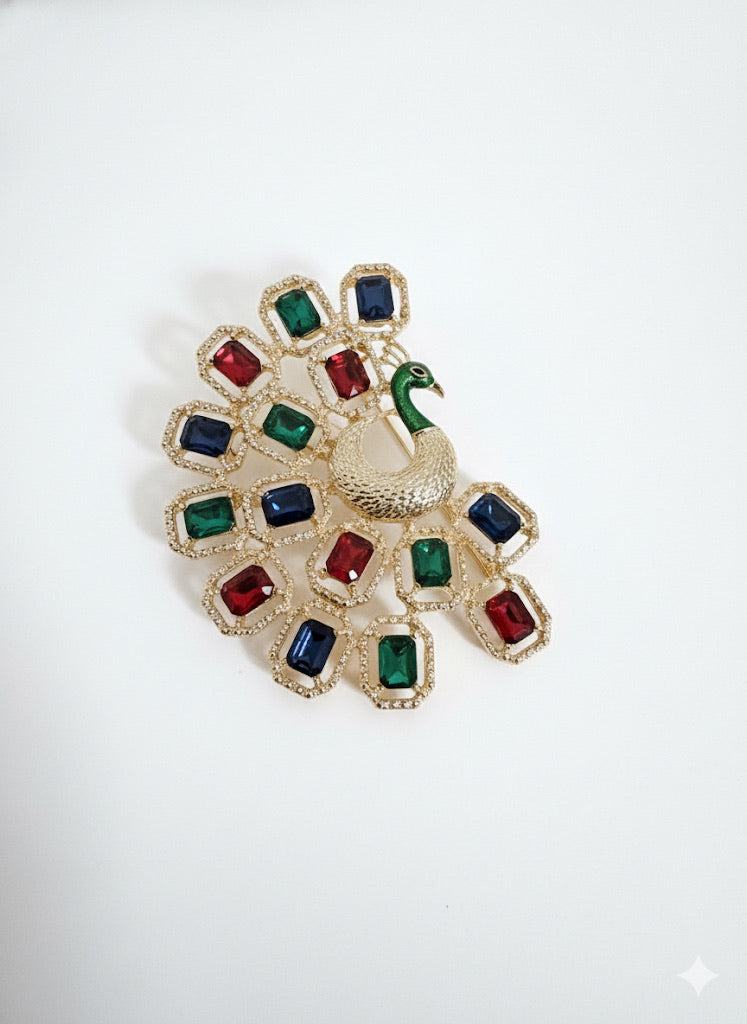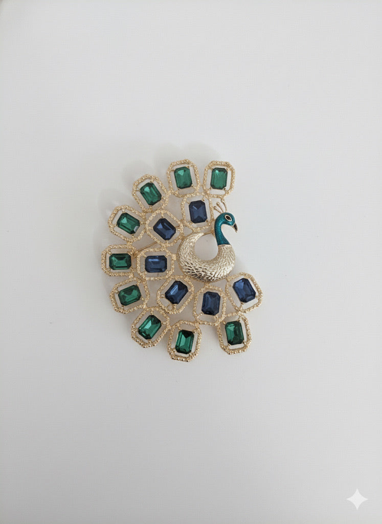 Une broche paon majestueuse, dorée et ornée de pierres éclatantes, idéale pour apporter une touche royale à n’importe quelle tenue.