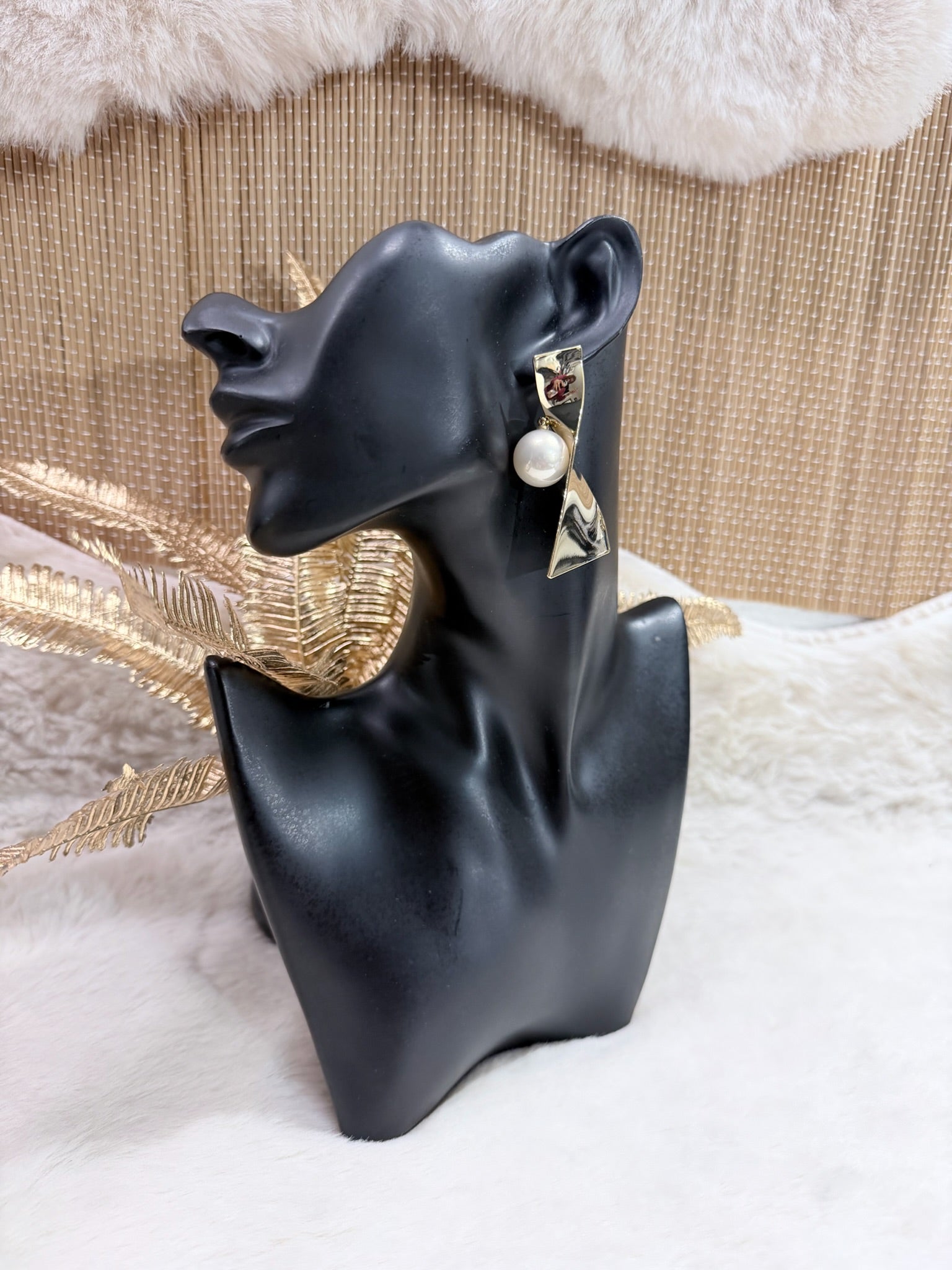 Boucles d’oreilles en acier inoxydable doré, au design sculptural moderne rehaussé d’une perle élégante.