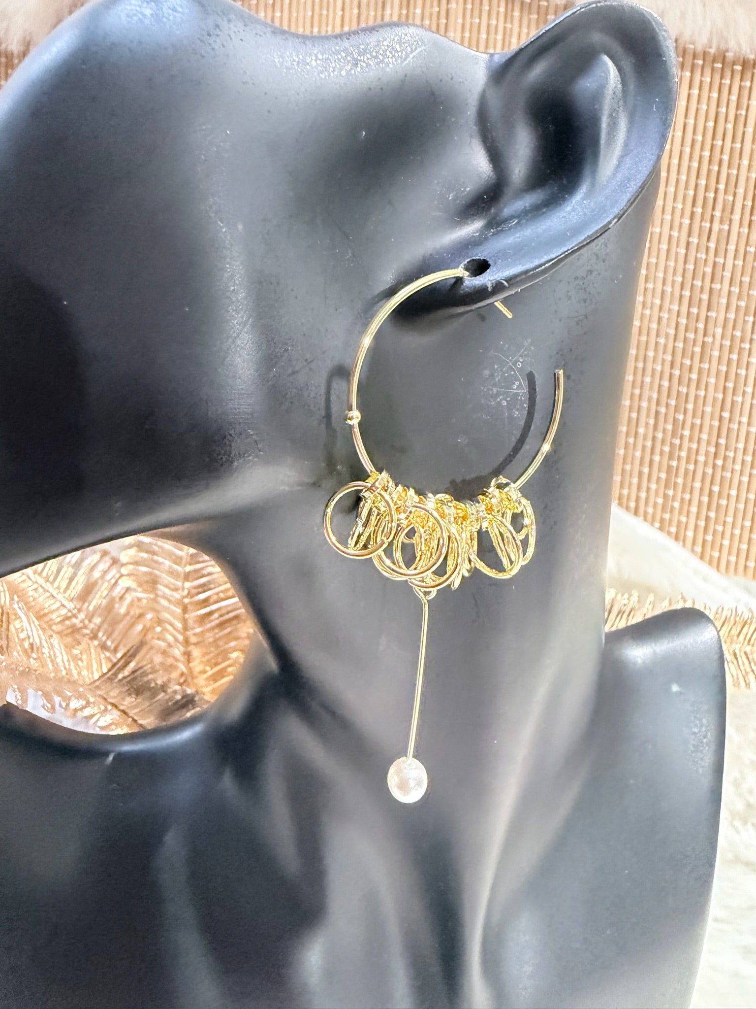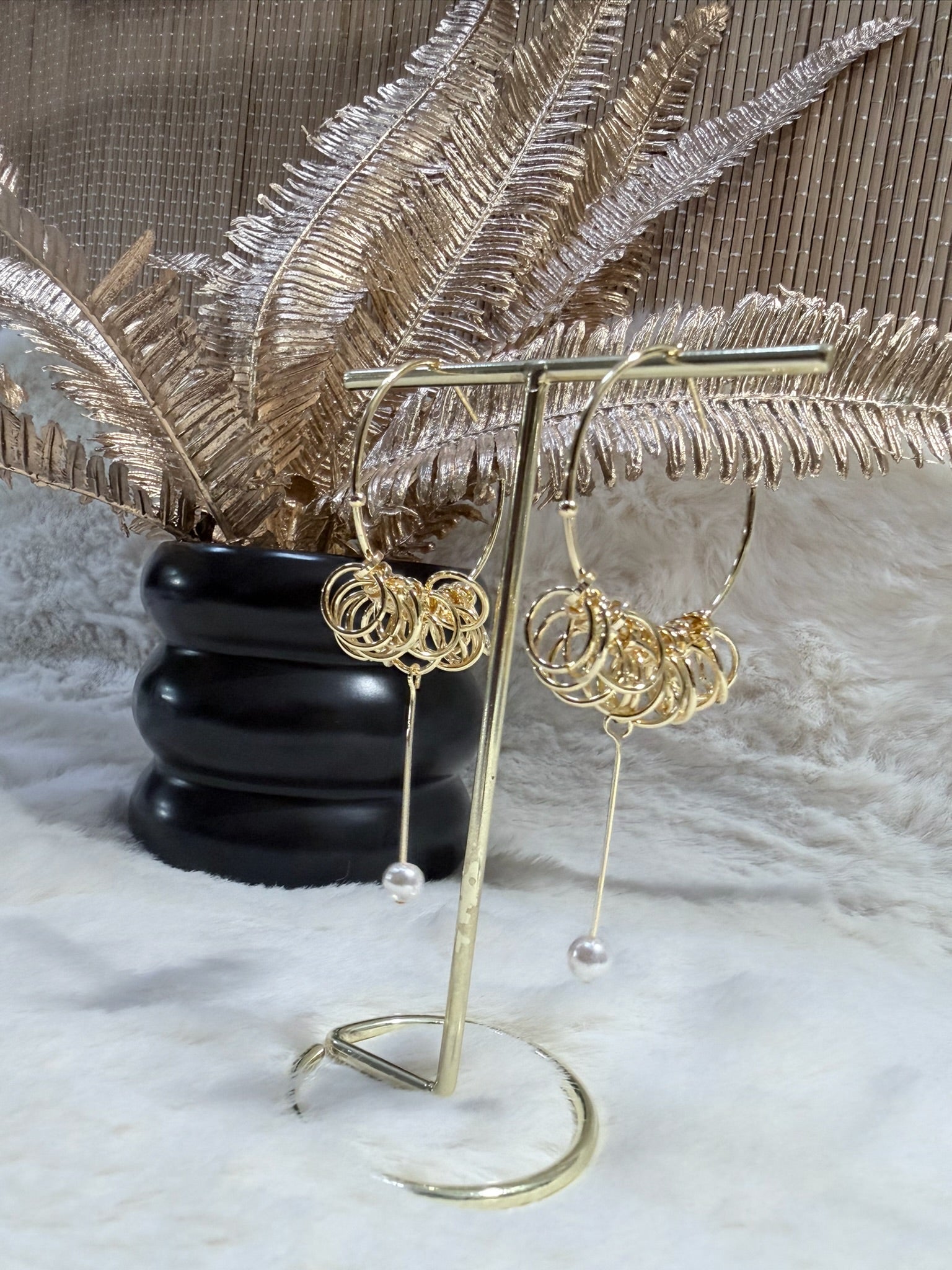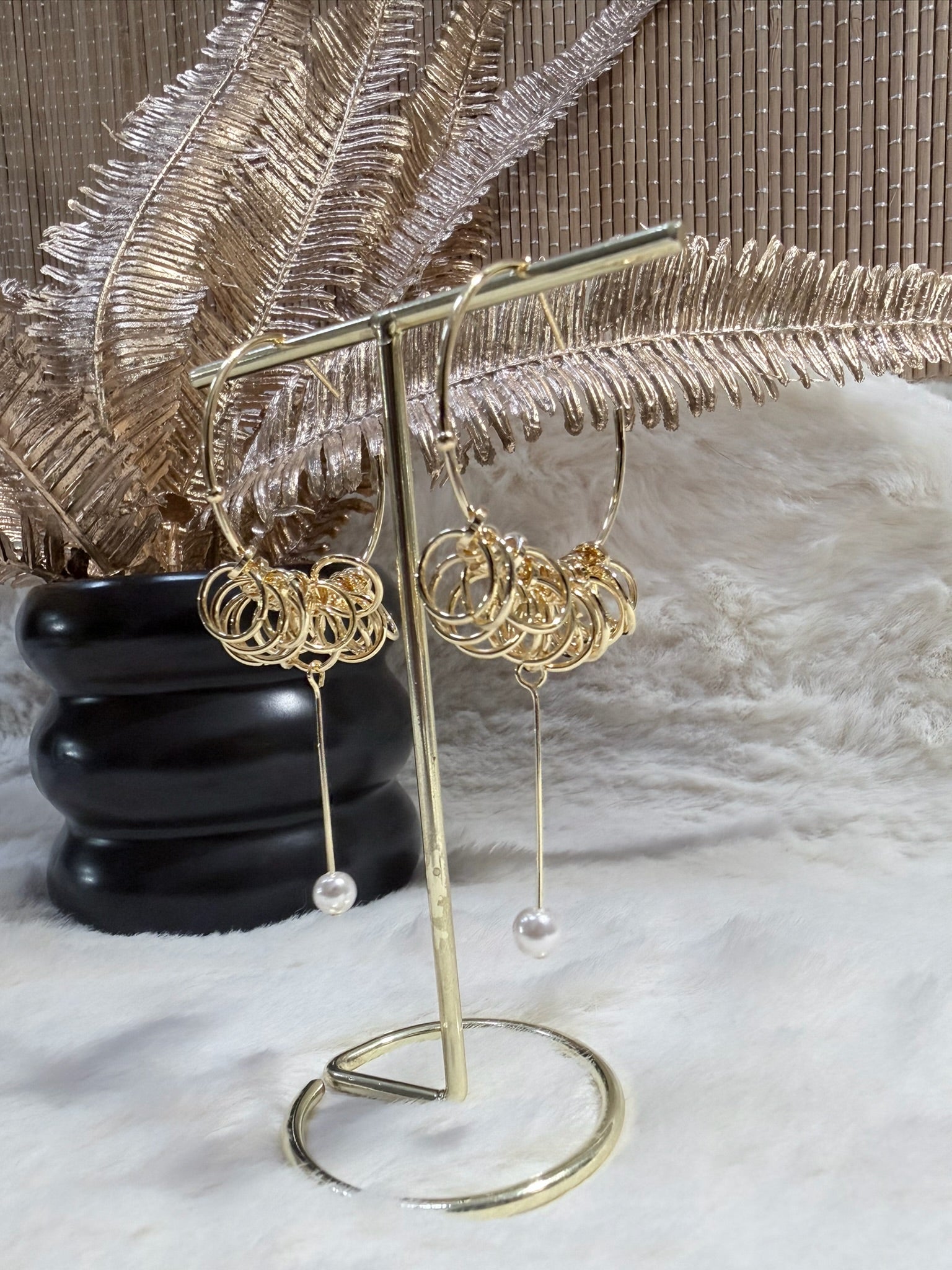 Boucles d’oreilles en acier inoxydable doré, composées d’anneaux entrelacés et d’une perle pendante pour une allure moderne et raffinée.