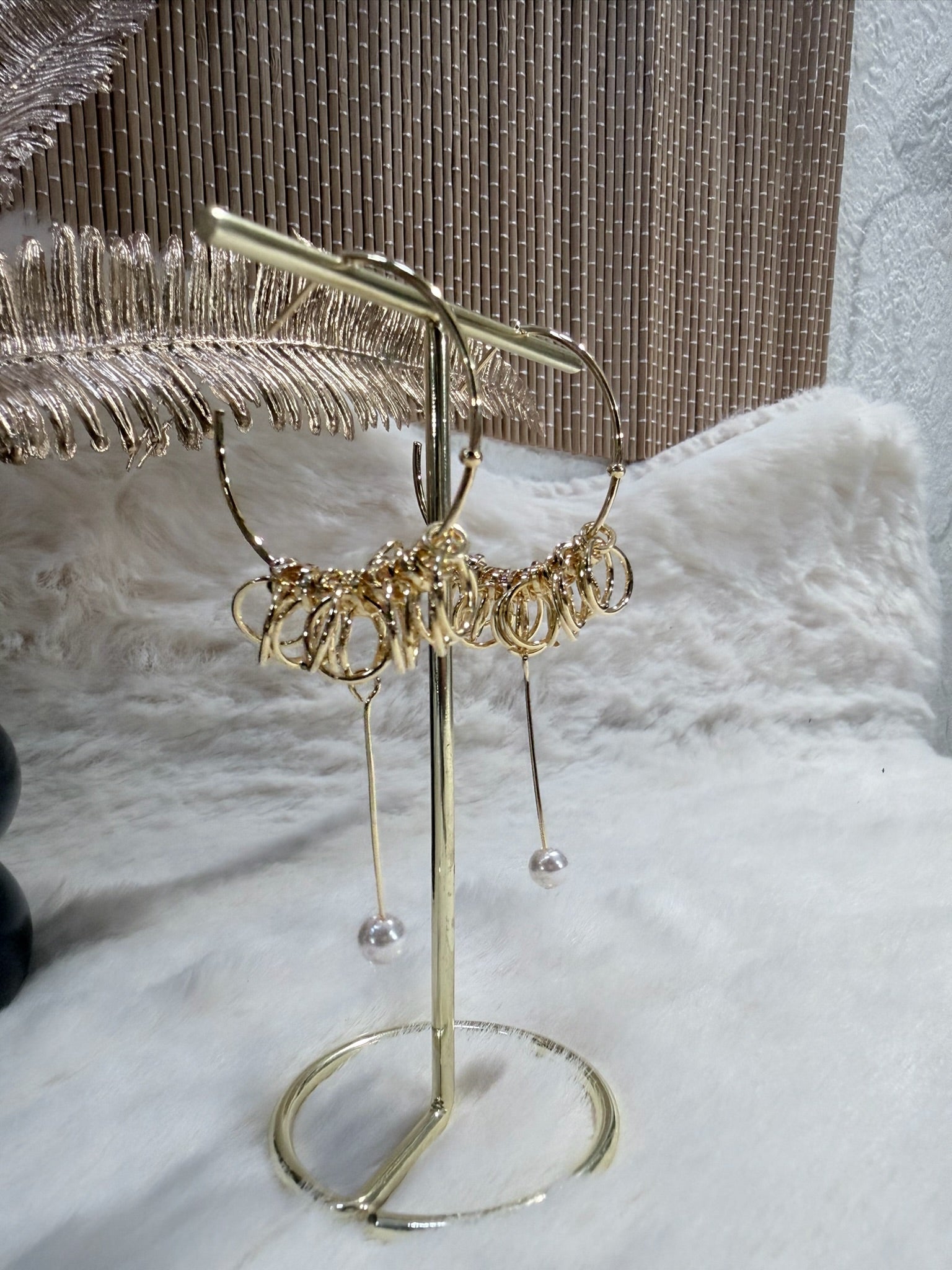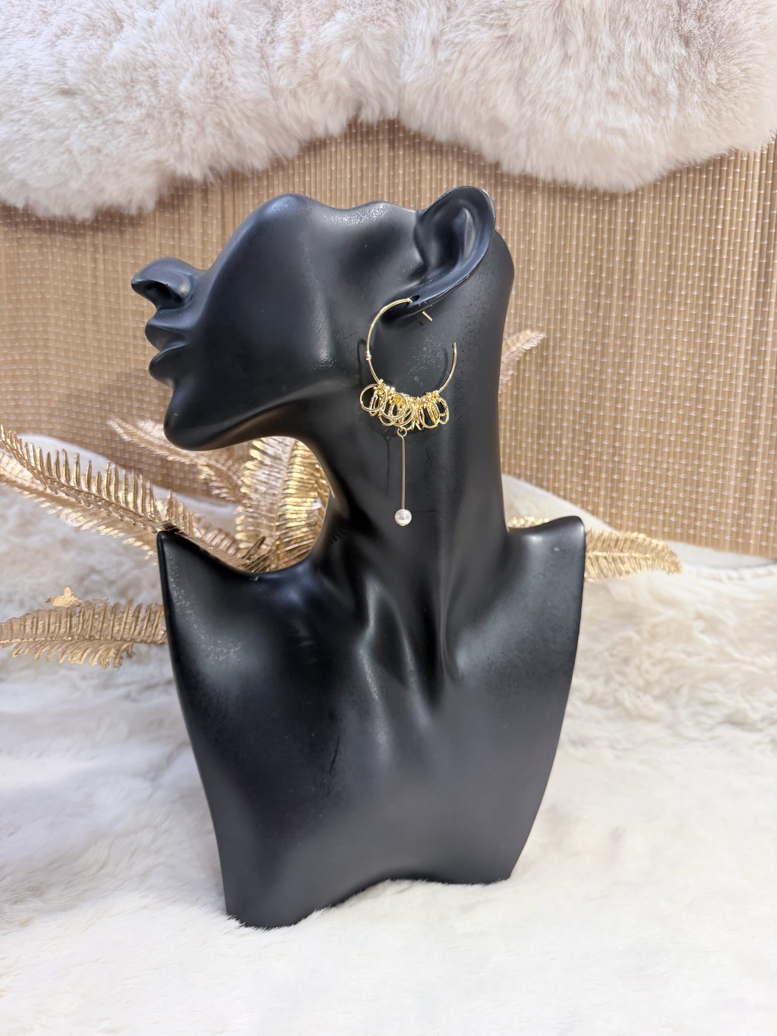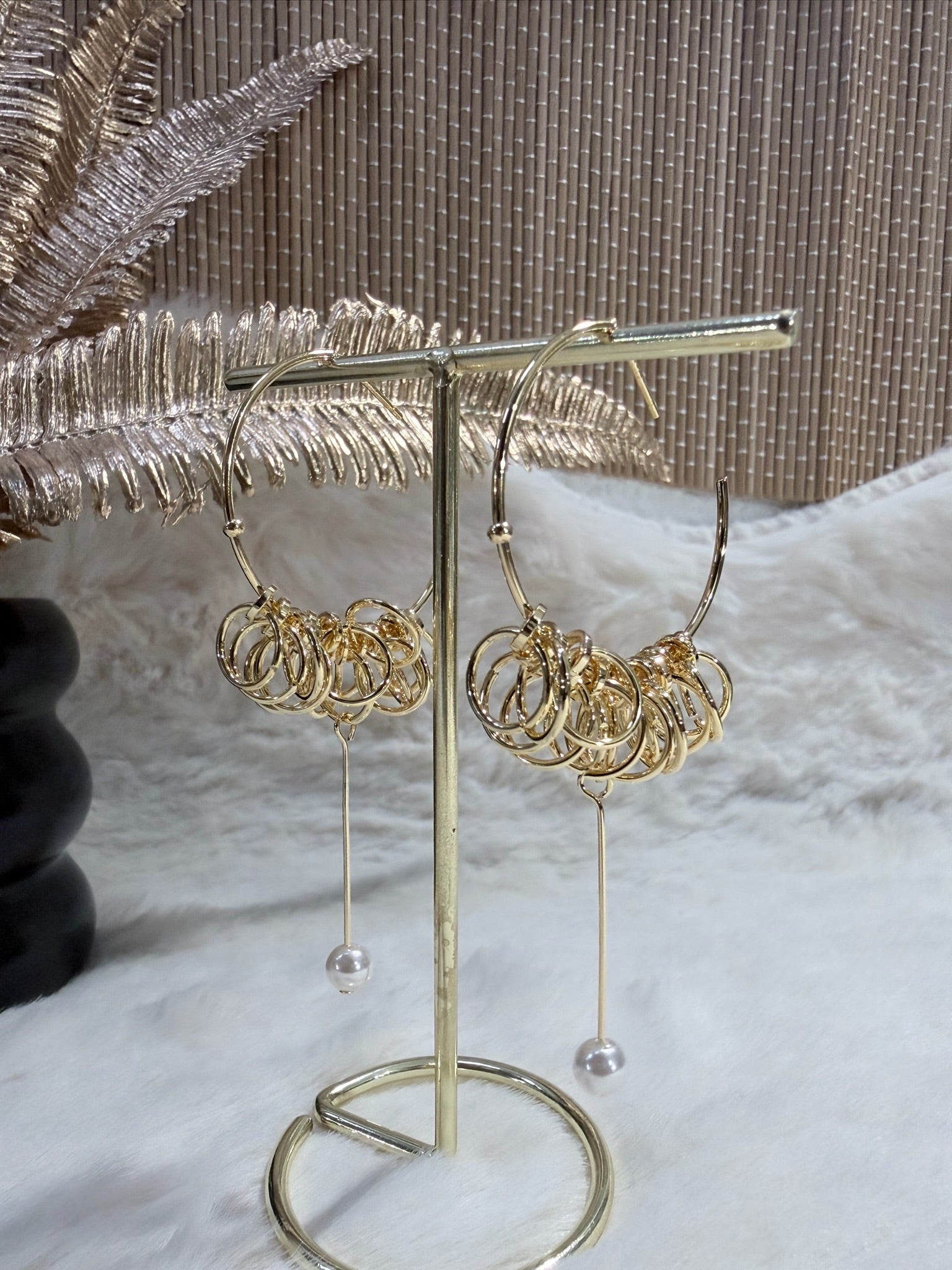 Boucles d’oreilles en acier inoxydable doré, composées d’anneaux entrelacés et d’une perle pendante pour une allure moderne et raffinée.
