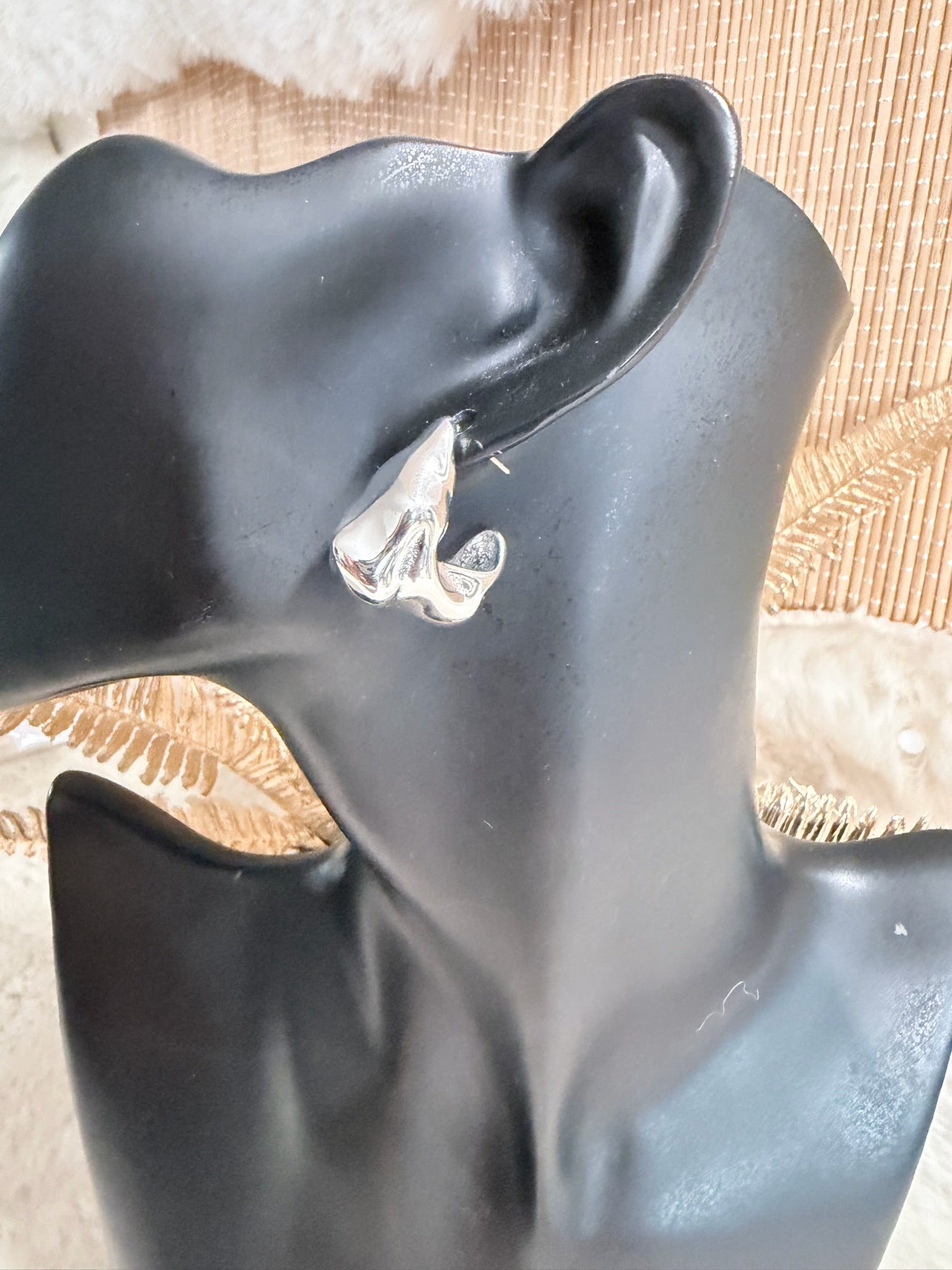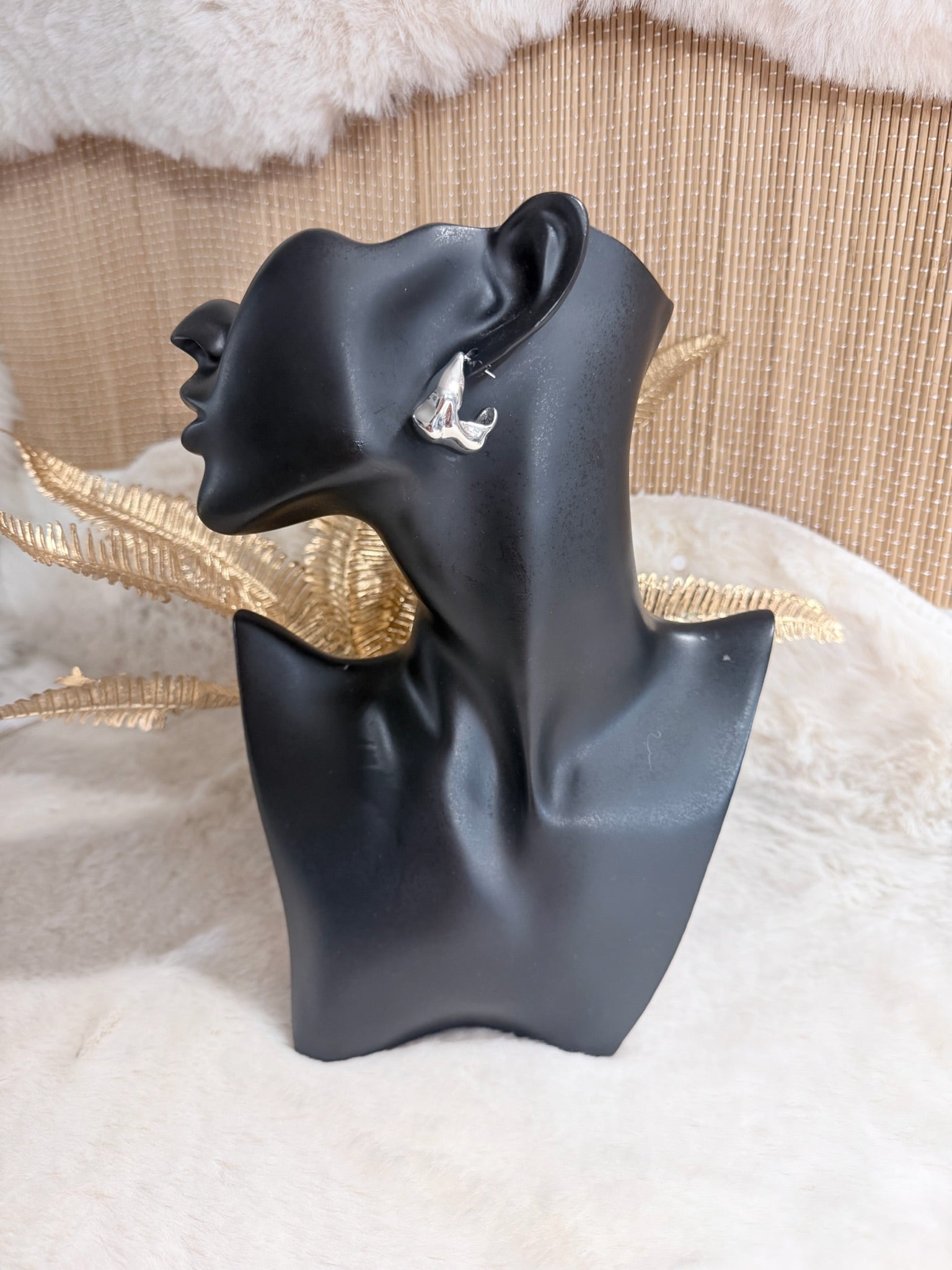 Boucles d’oreilles en acier inoxydable argenté, au design organique et sculptural, parfaites pour apporter une touche moderne et artistique à n’importe quel look.