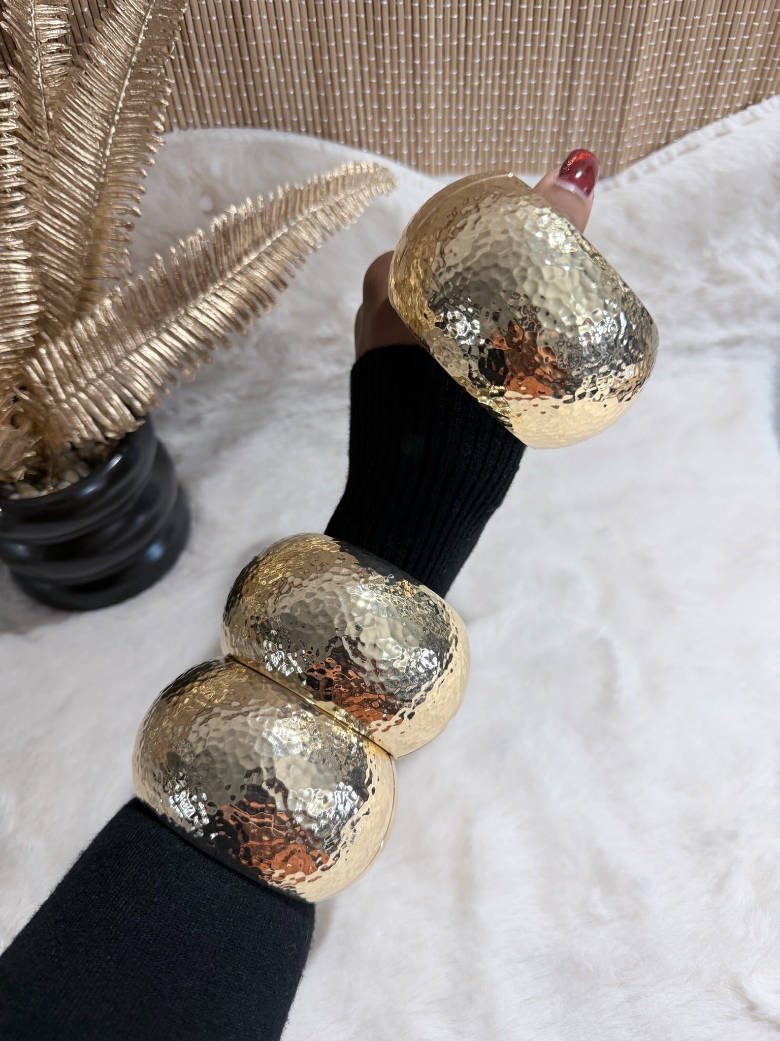 Un bracelet martelé au design imposant, qui capte la lumière et affirme une élégance puissante et assumée.