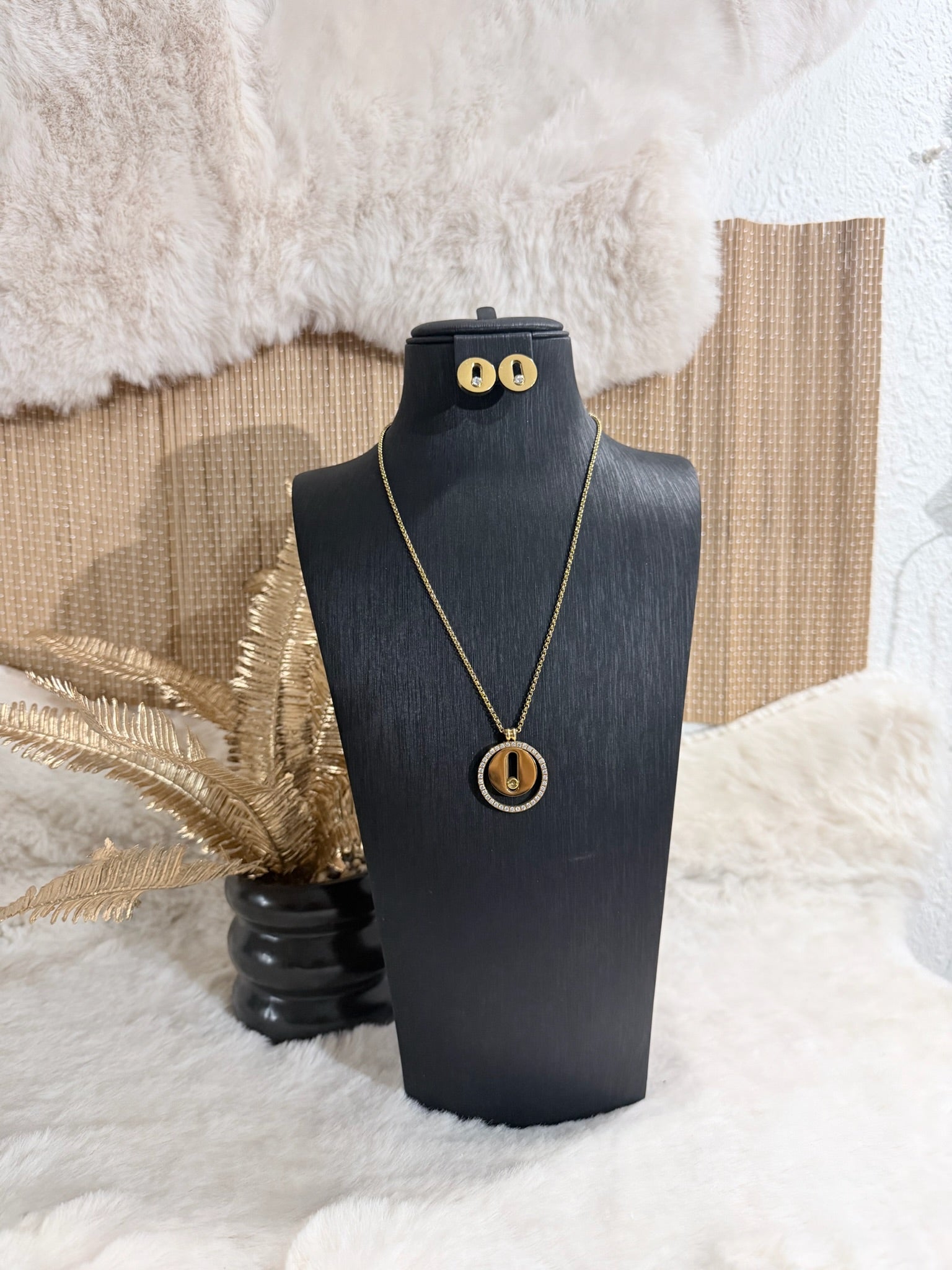 Parure en acier inoxydable doré, composée d’un collier et de boucles d’oreilles à pendentif rond sublimé de détails brillants.