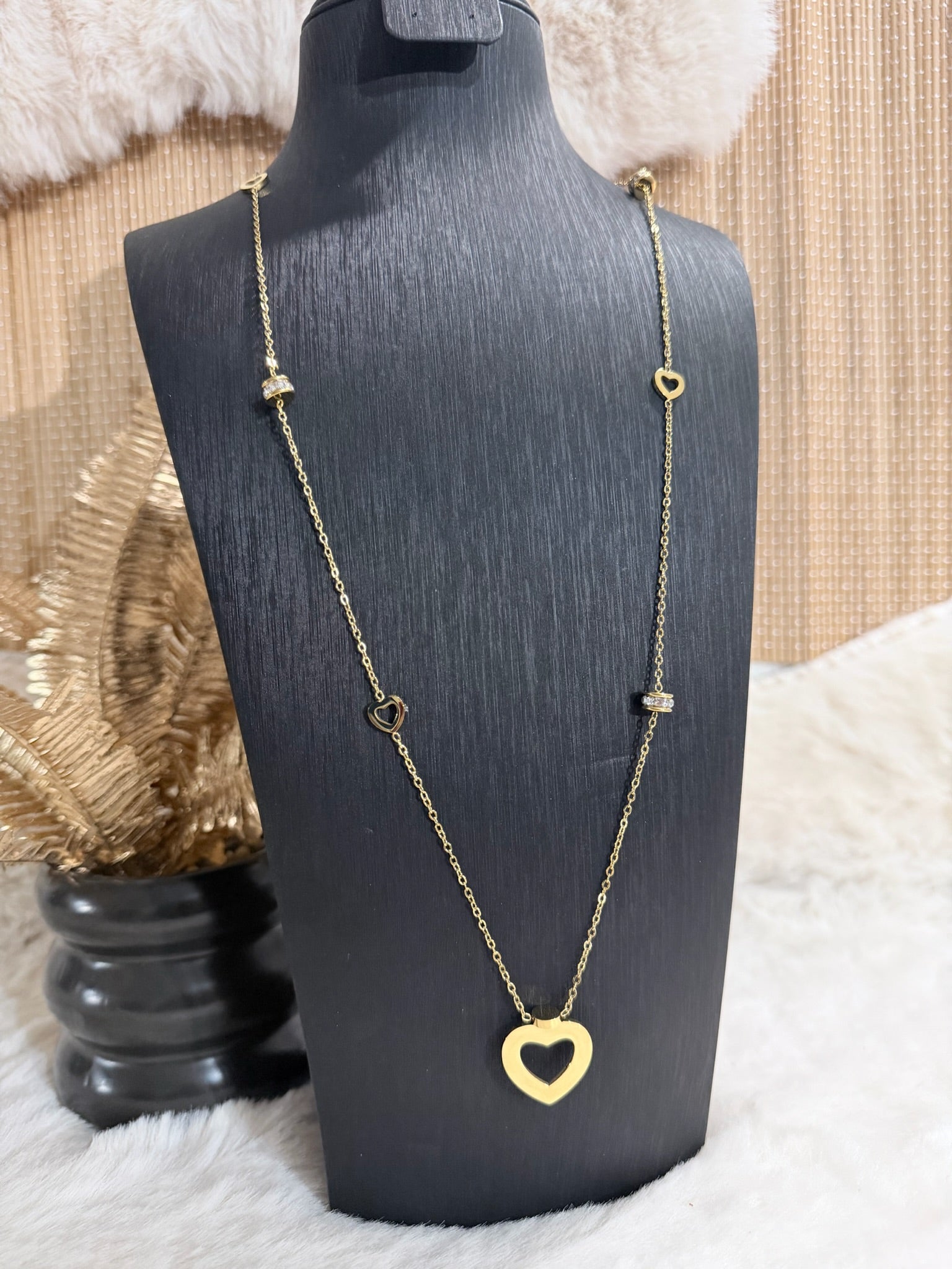 Sautoir doré délicat, agrémenté de petits cœurs et d’un pendentif cœur central pour une allure douce et féminine.