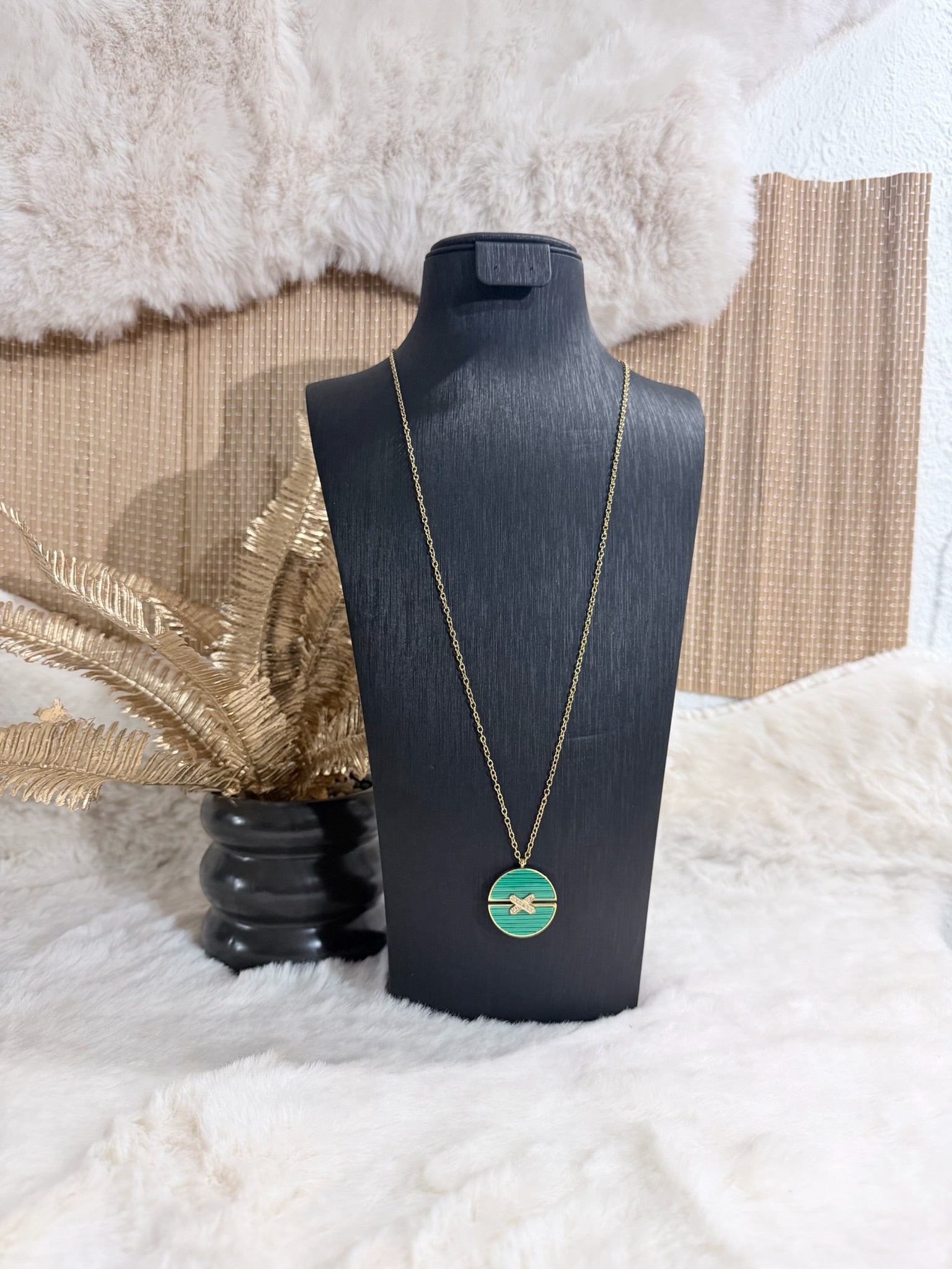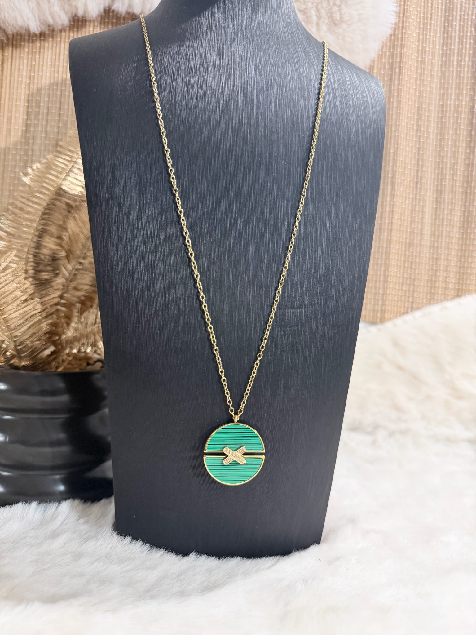 Sautoir en acier inoxydable doré, rehaussé d’un pendentif noir ou vert texturé pour une allure chic et sophistiquée.