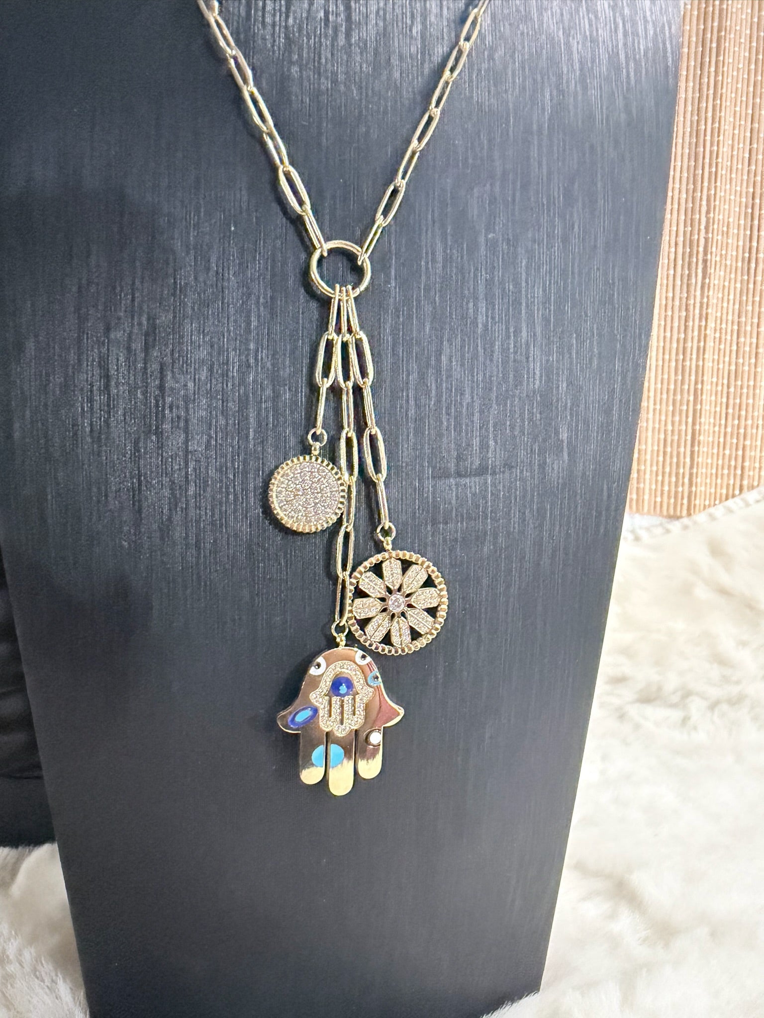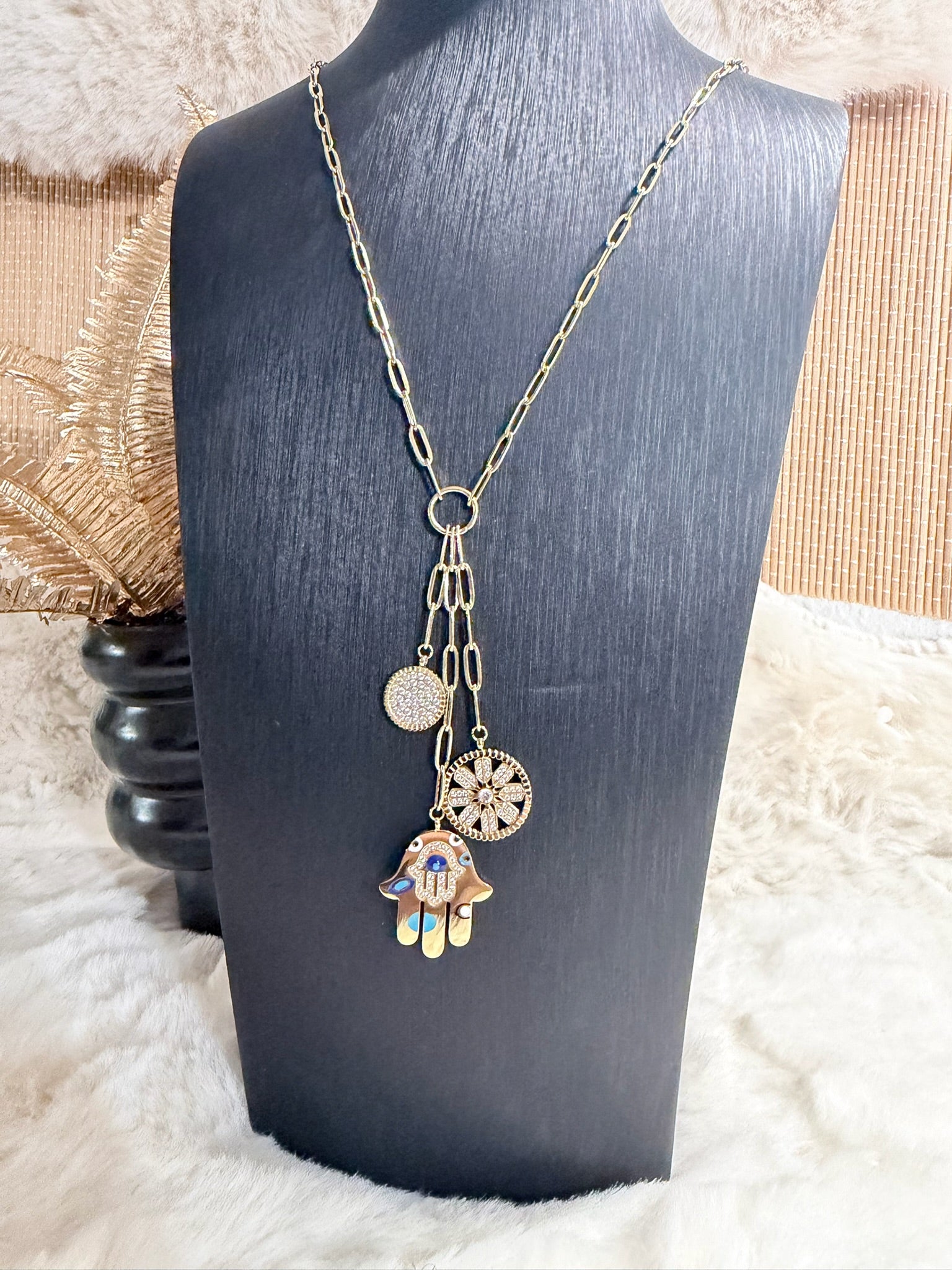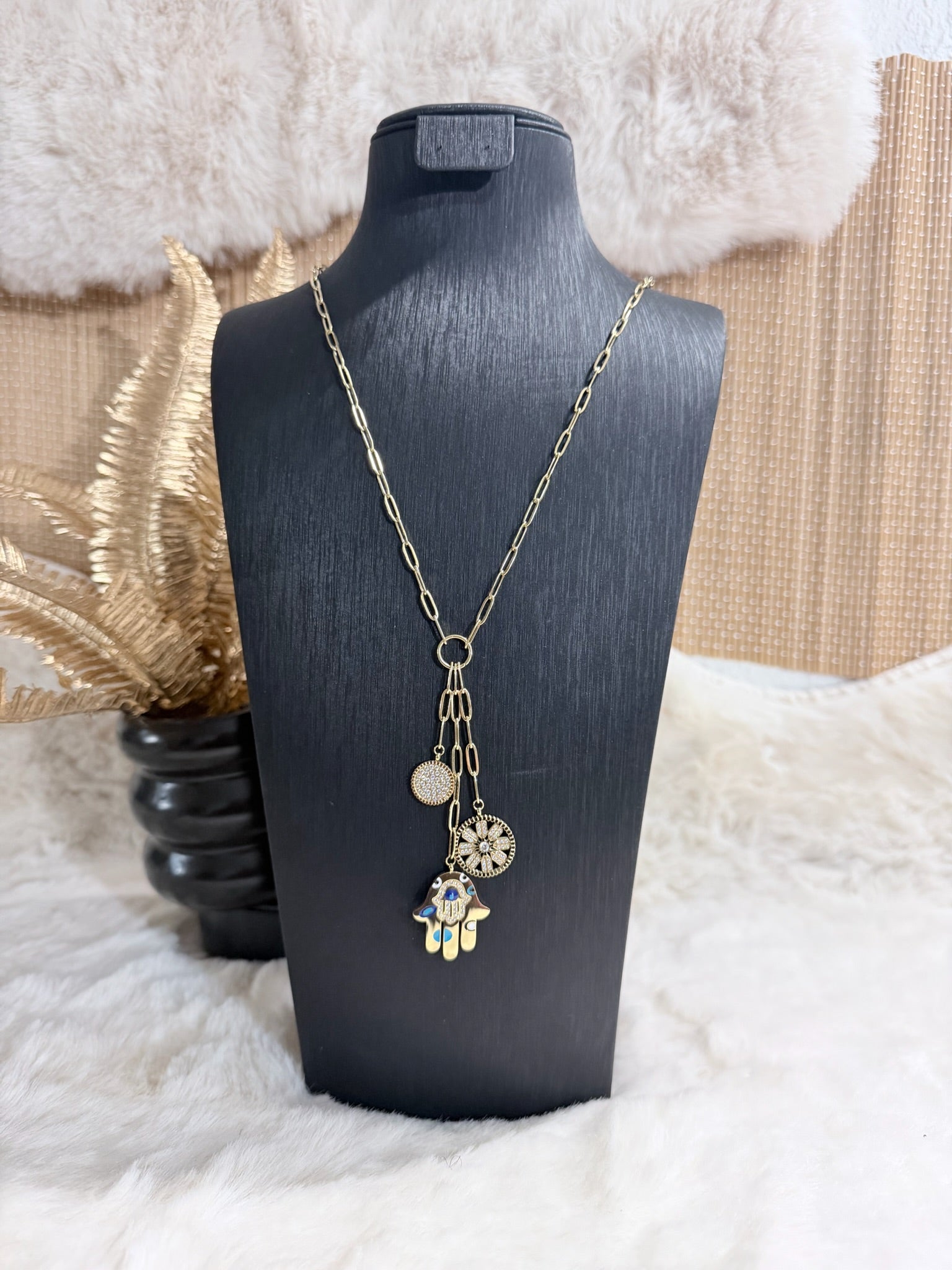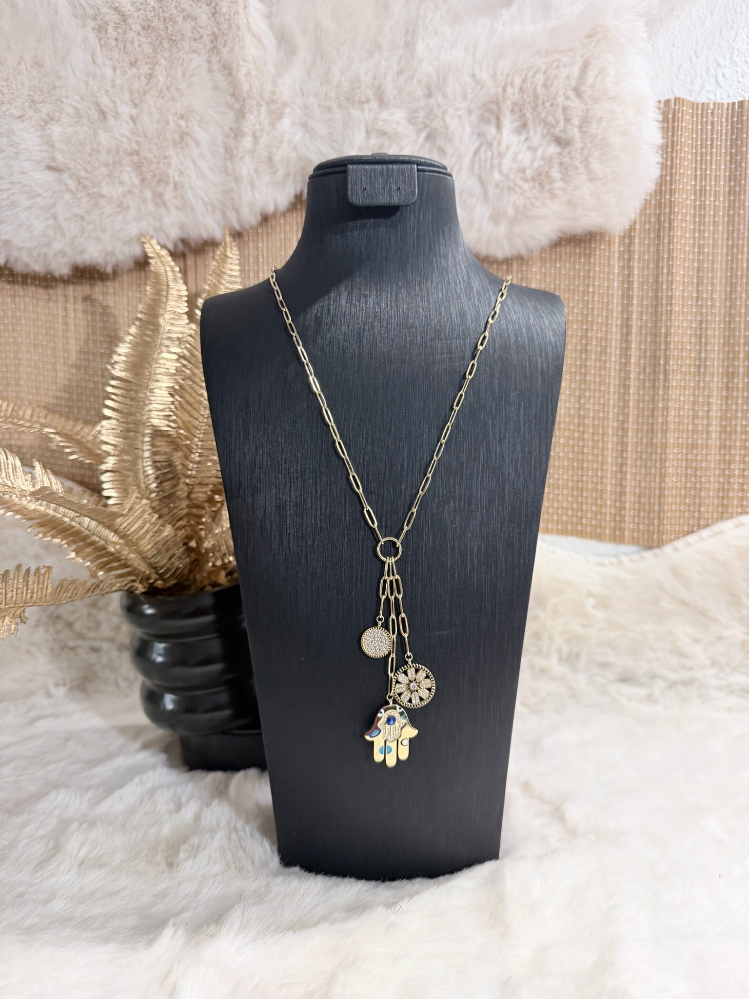 Collier doré avec pendentifs mains de fatma et détails scintillants, pour une allure élégante et symbolique.