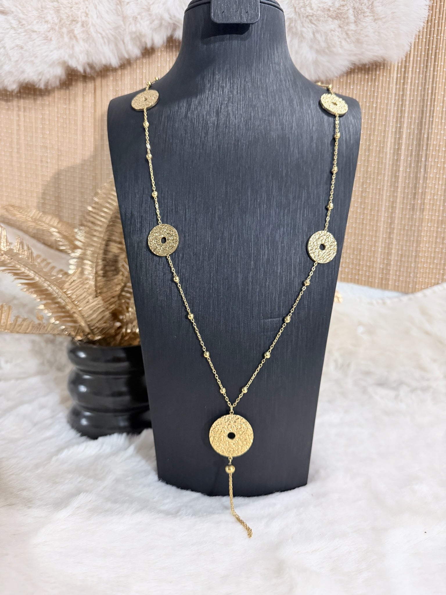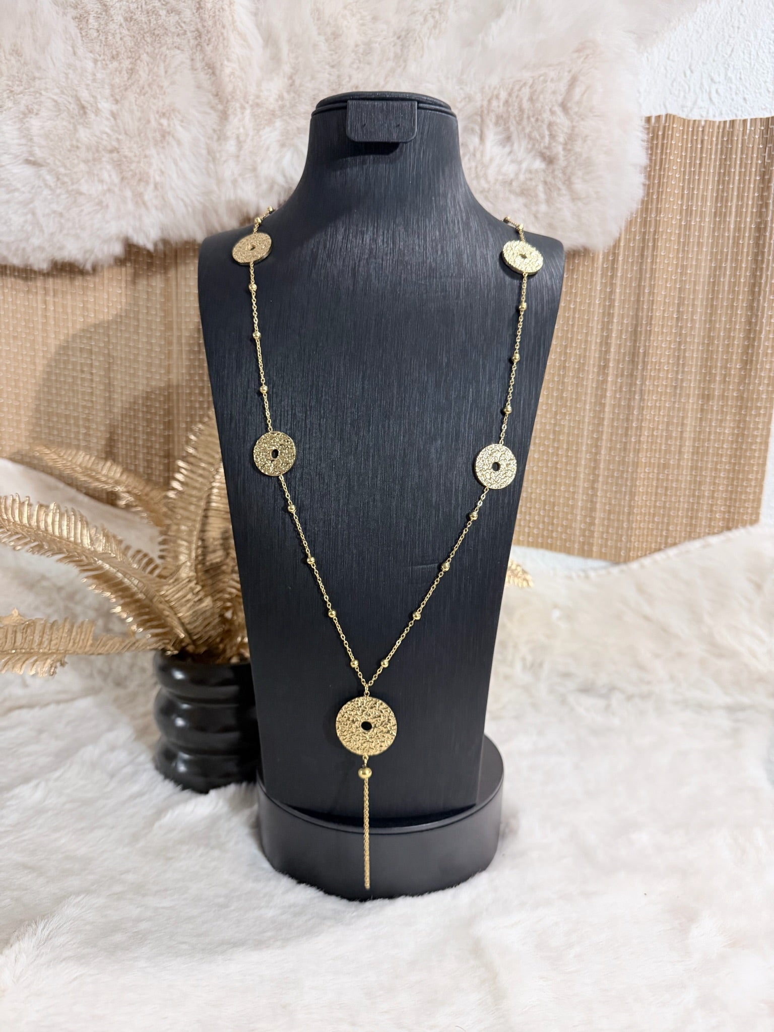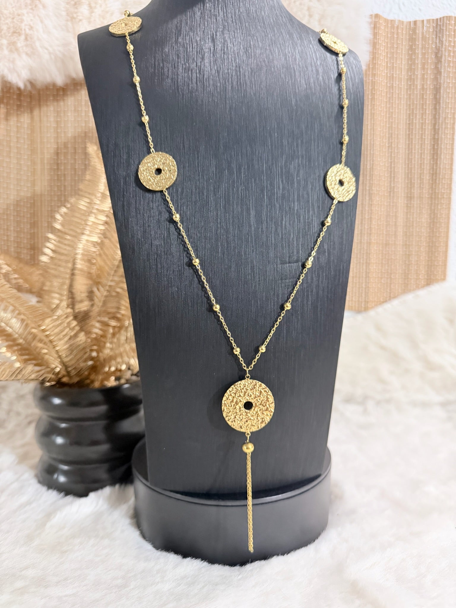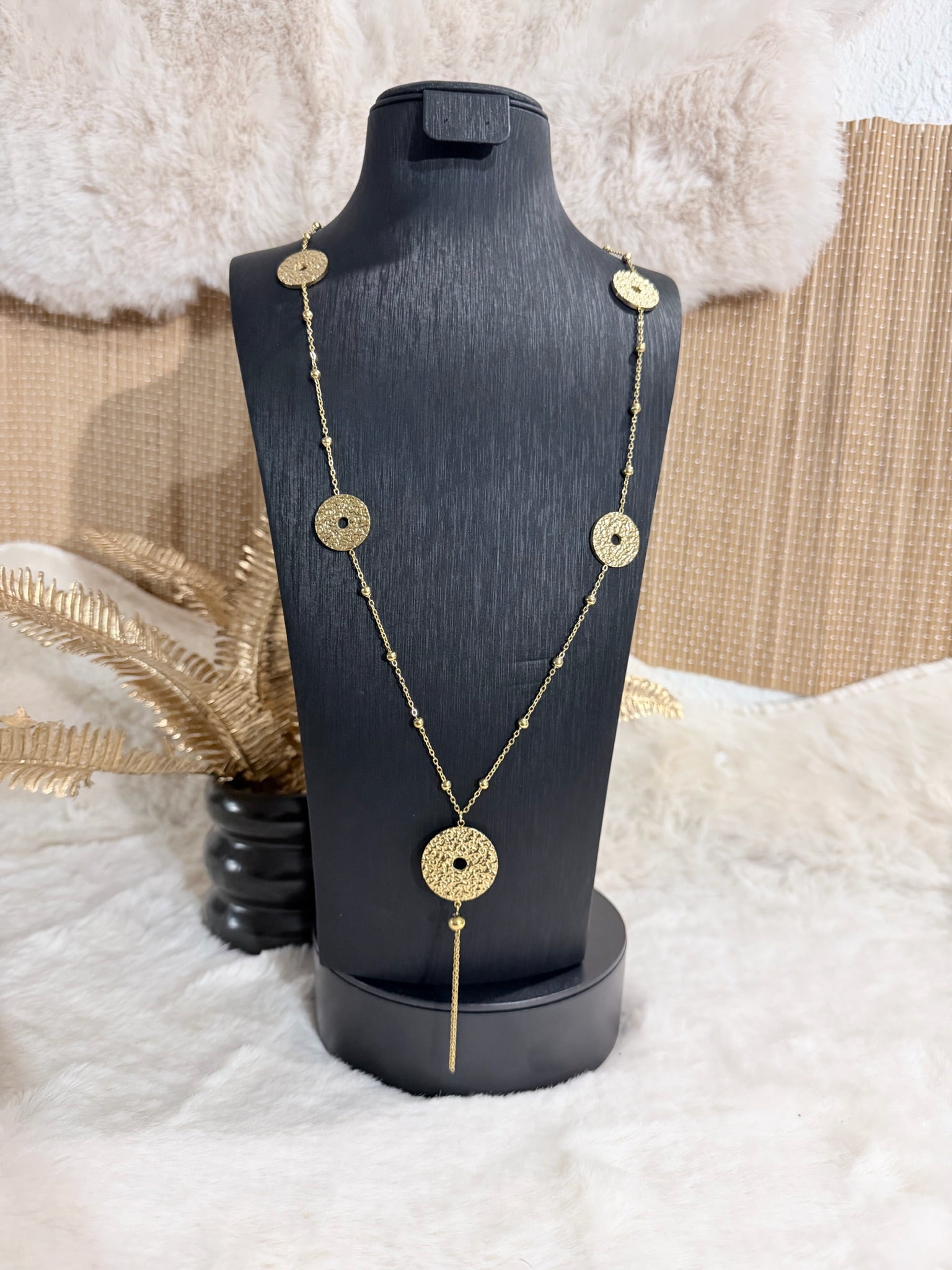 Sautoir doré orné de médaillons texturés pour une allure éclatante et sophistiquée.