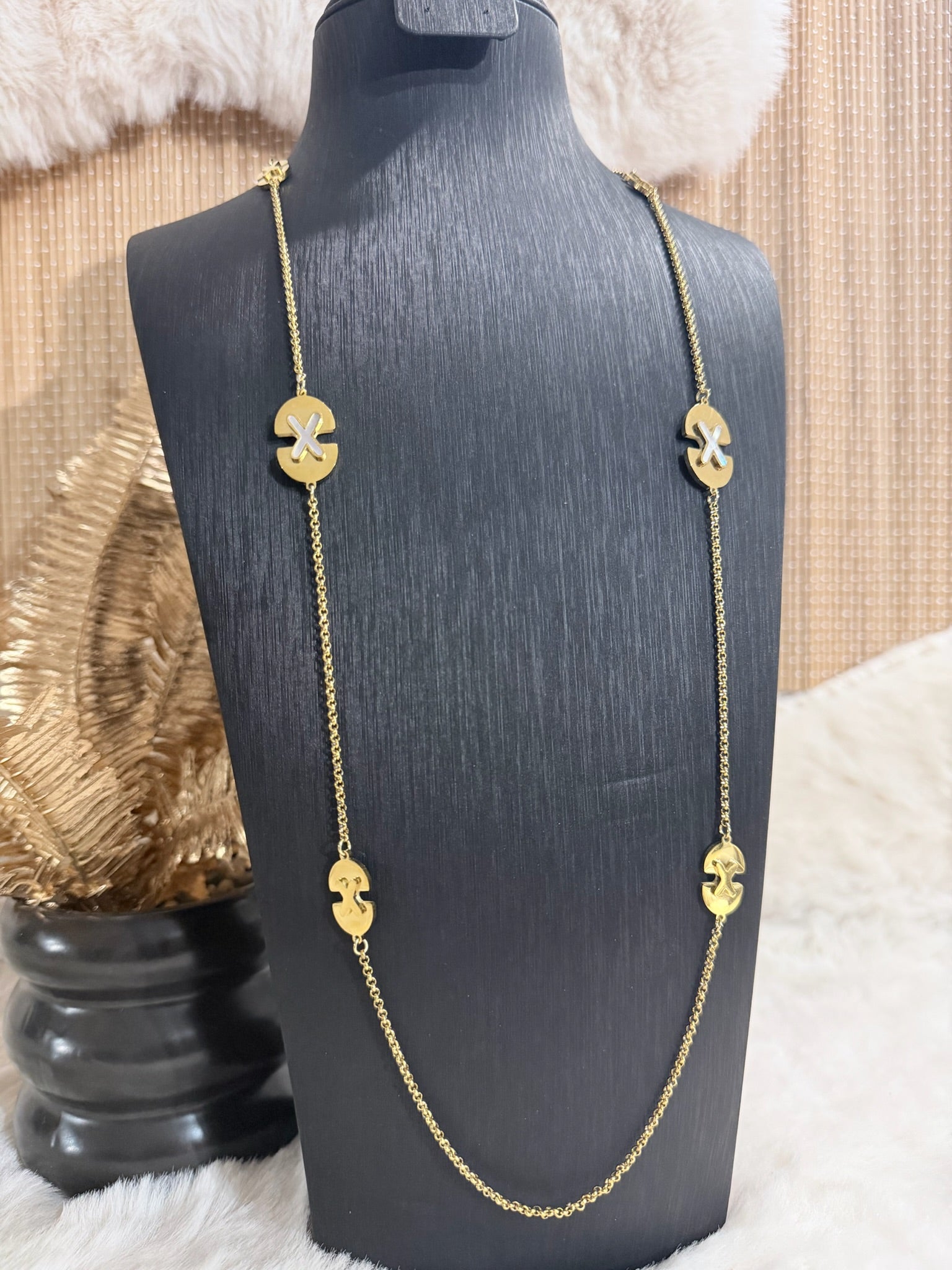 Sautoir en acier inoxydable doré, orné de motifs ajourés pour une touche élégante et raffinée.