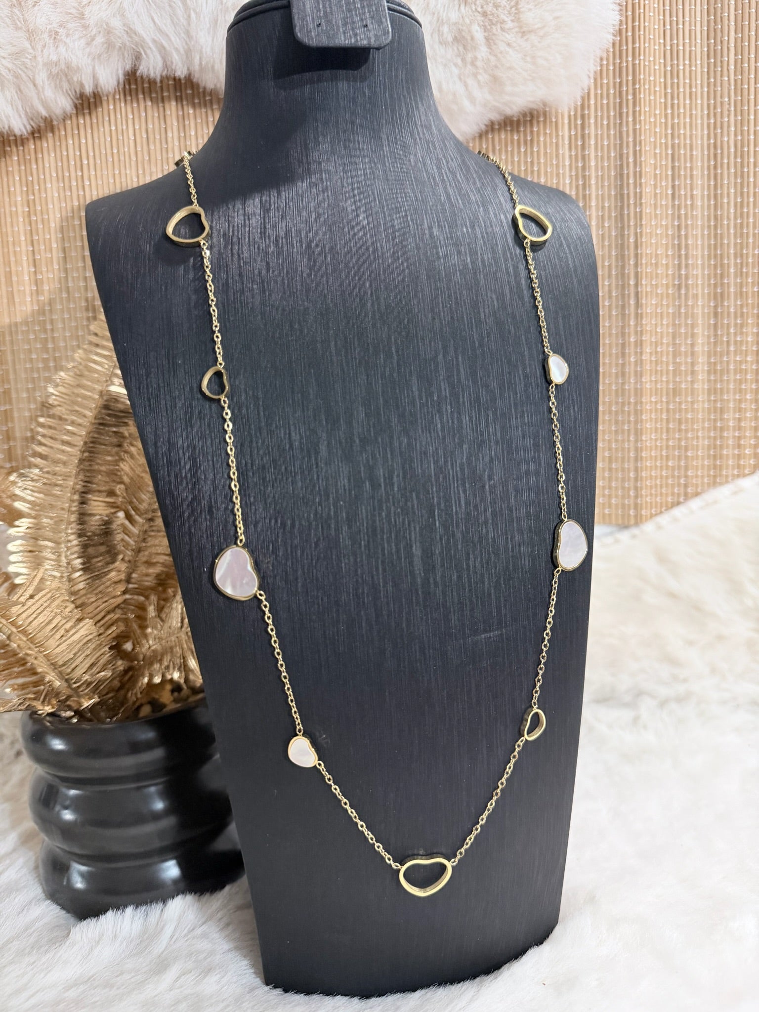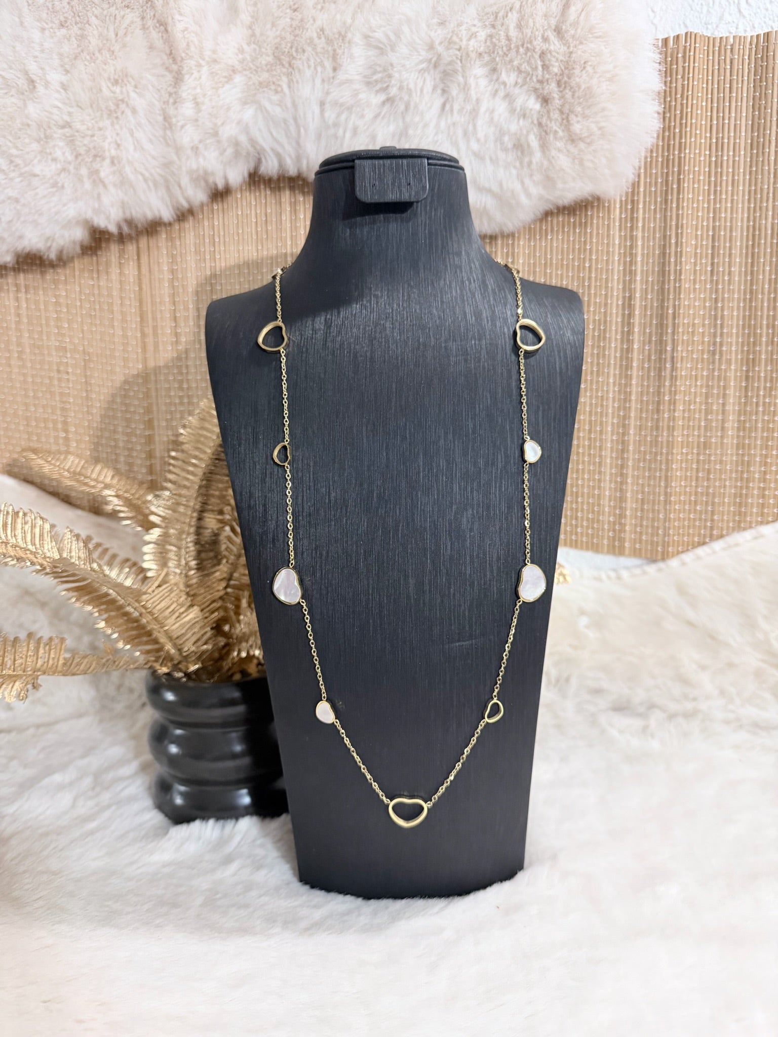 Sautoir doré orné de cœurs fins et de touches nacrées pour une allure douce et élégante.