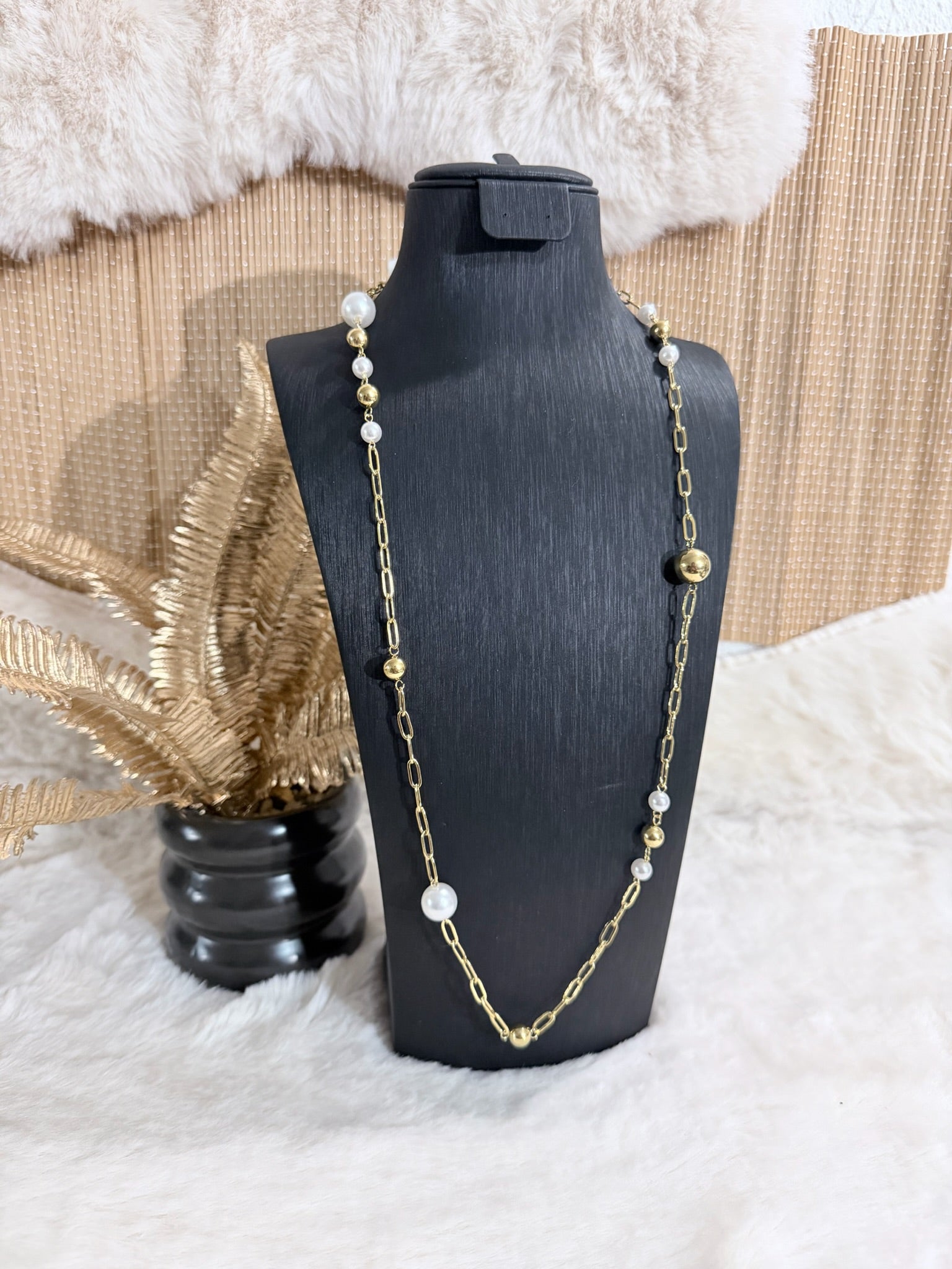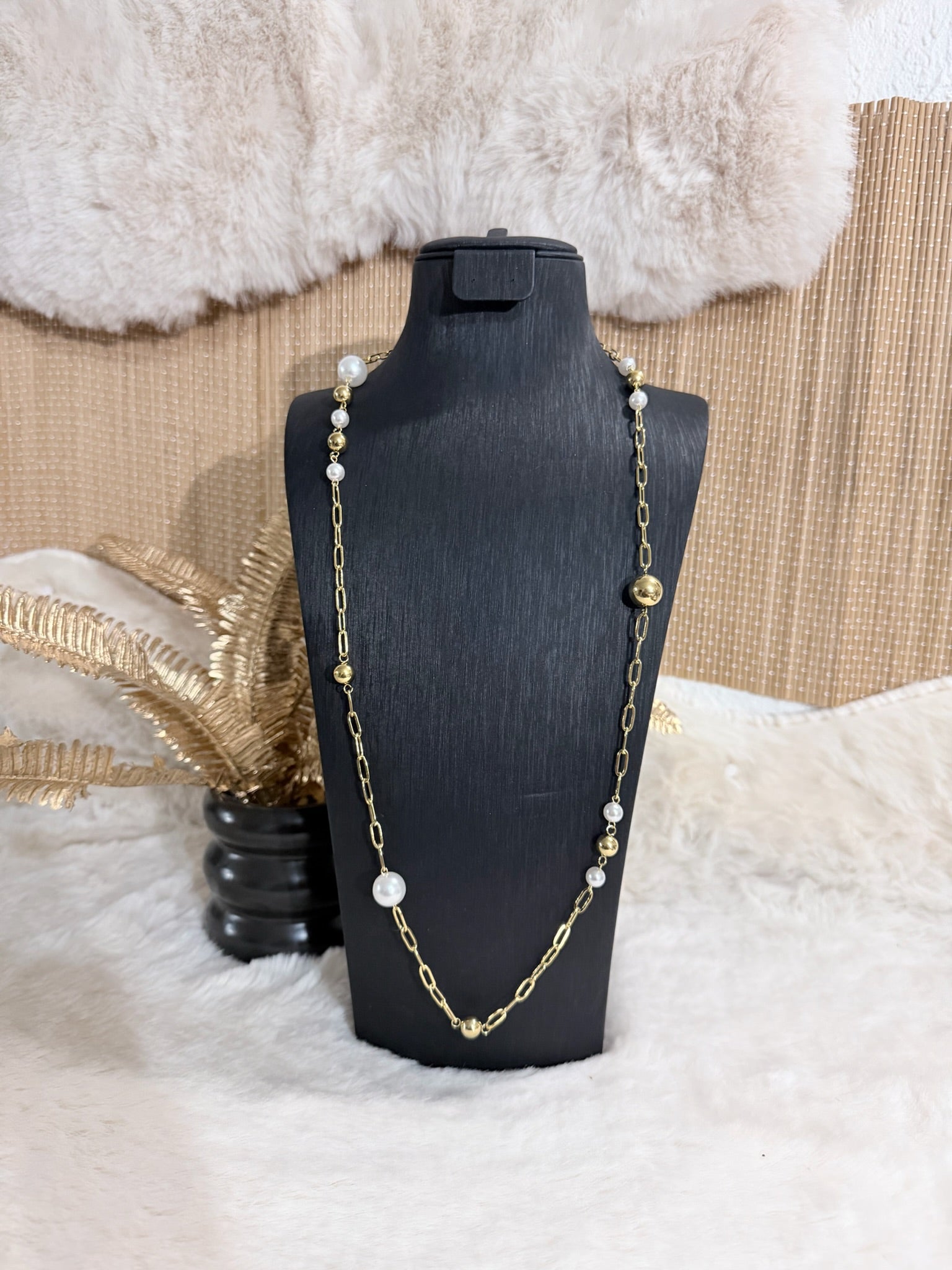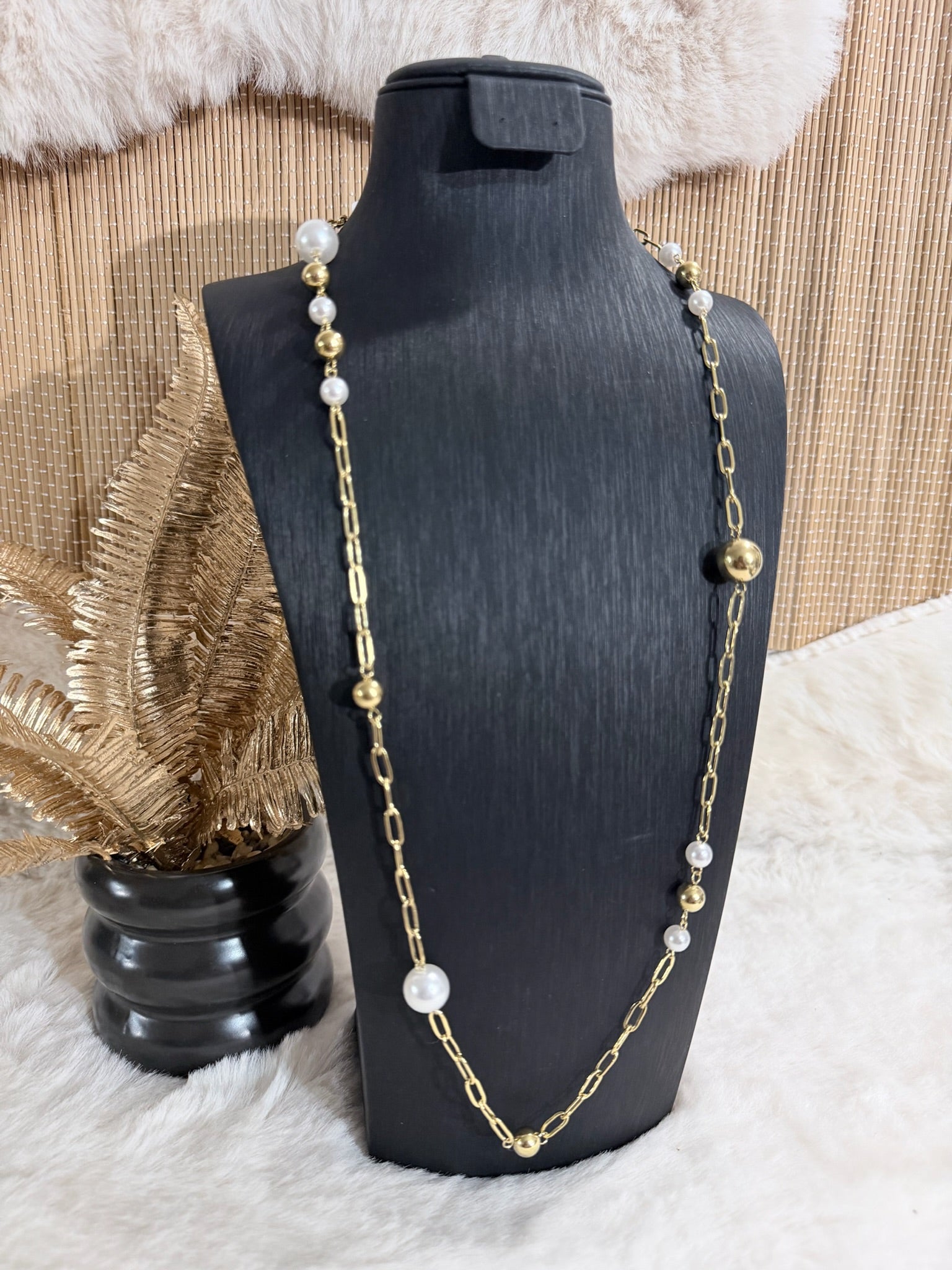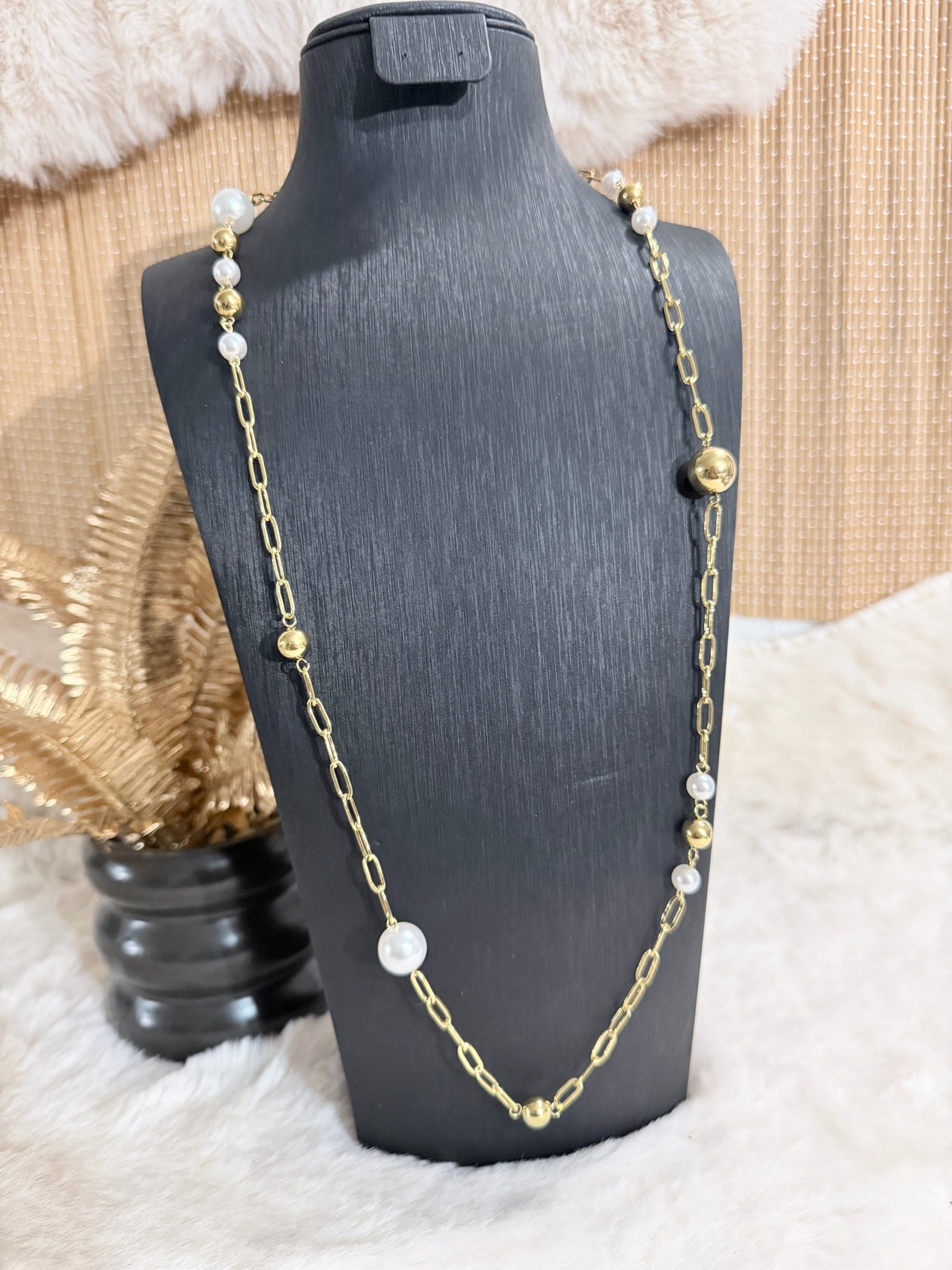 Sautoir doré à maillons, rehaussé de perles blanches et de billes métalliques pour une allure chic et intemporelle.