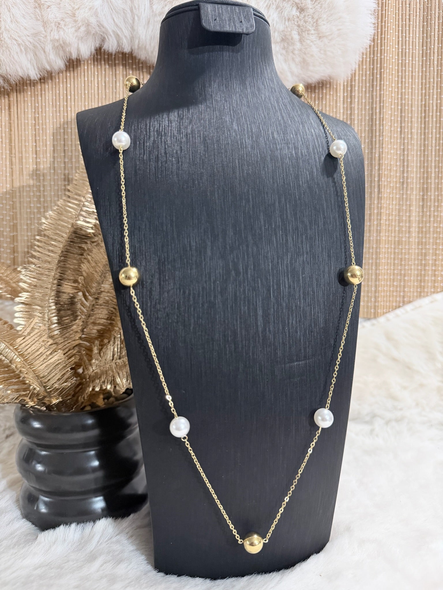 Sautoir doré mêlant perles blanches et billes métalliques pour une allure chic et intemporelle.