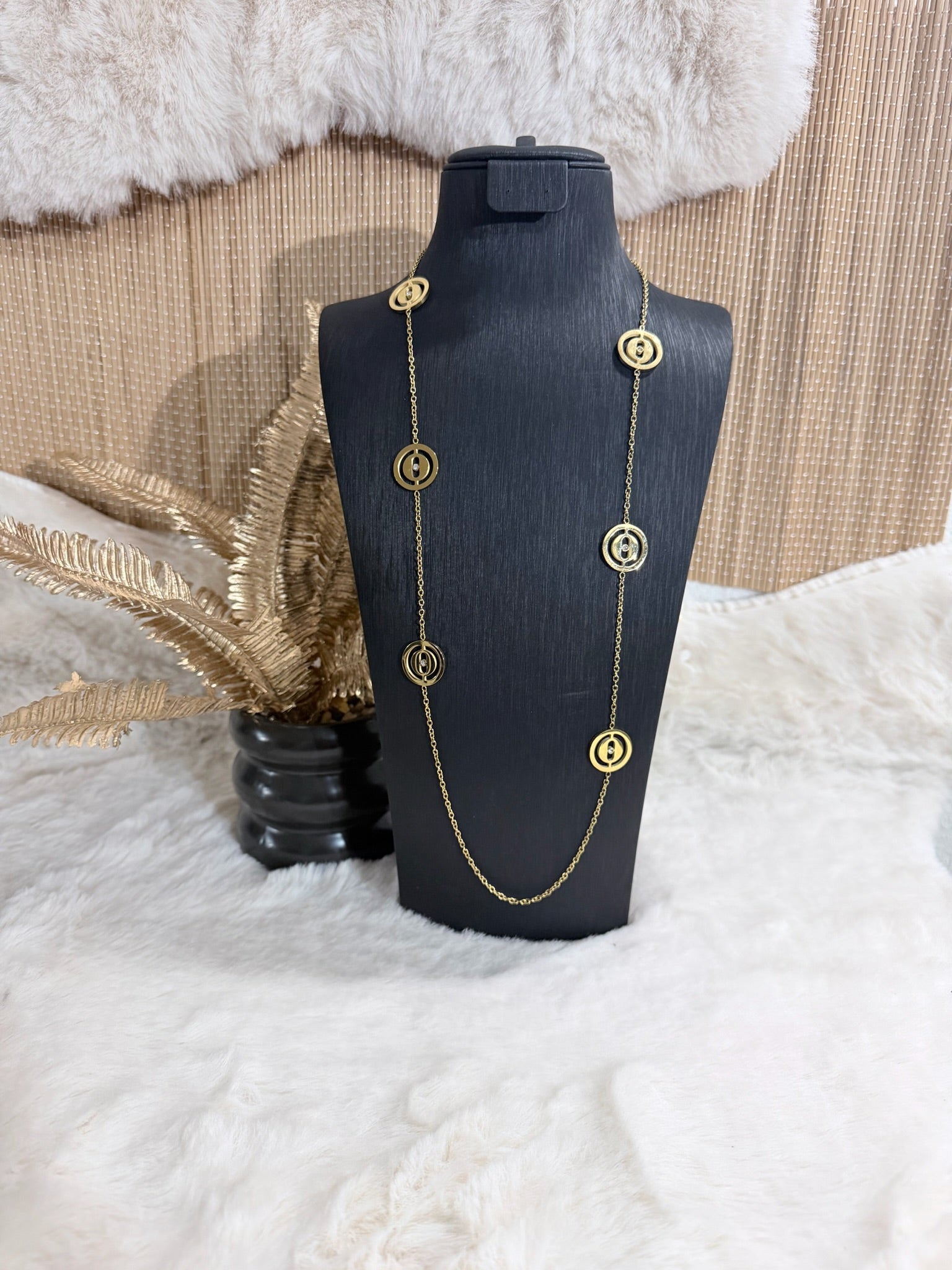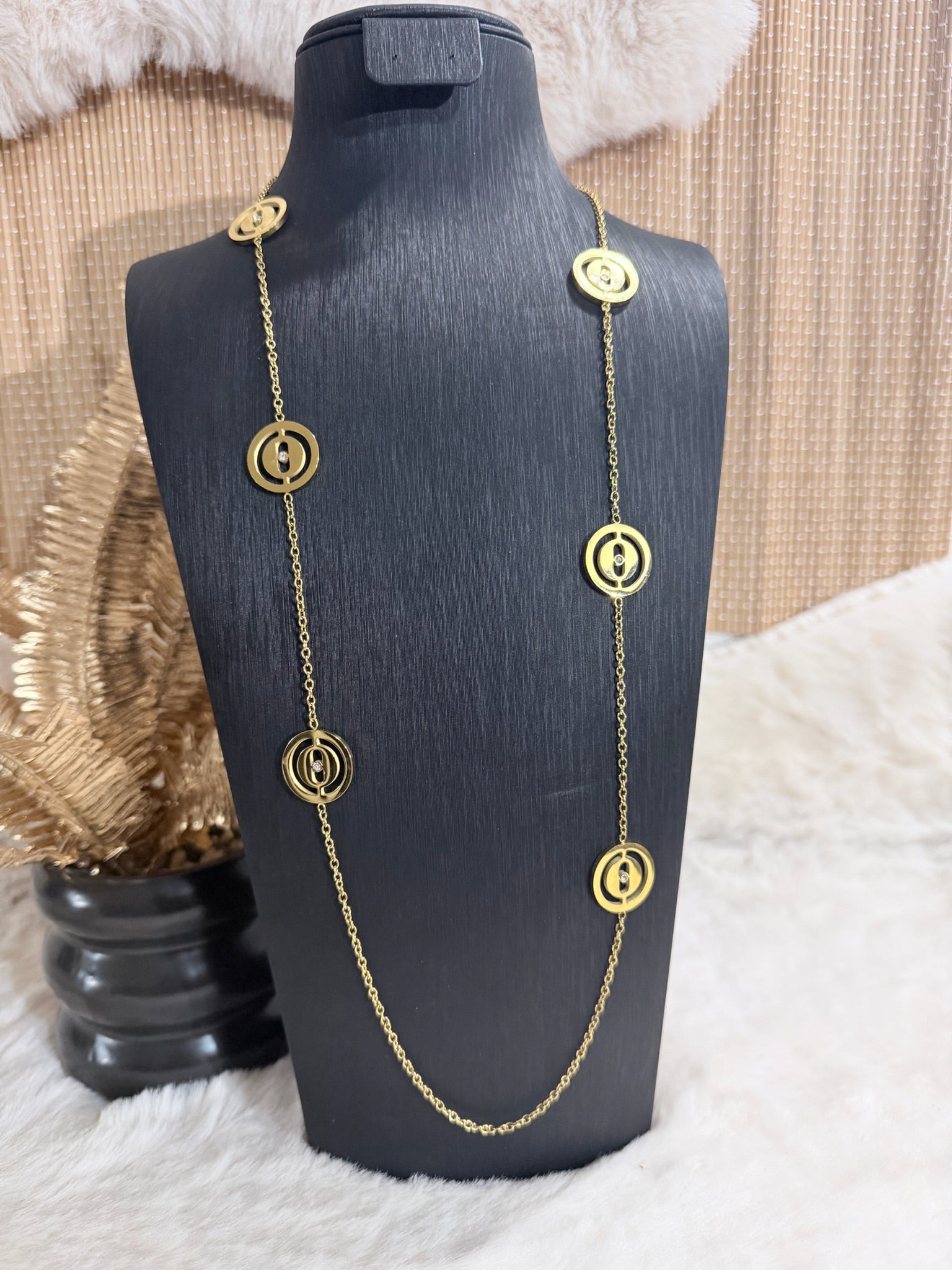 Collier sautoir en acier inoxydable doré, sublimé de médaillons géométriques pour une allure élégante et intemporelle.