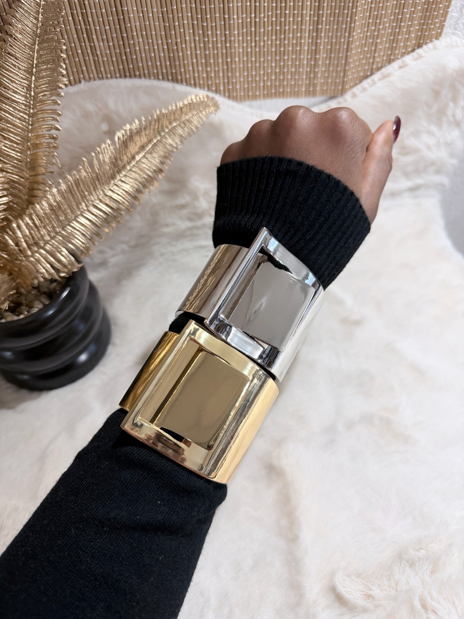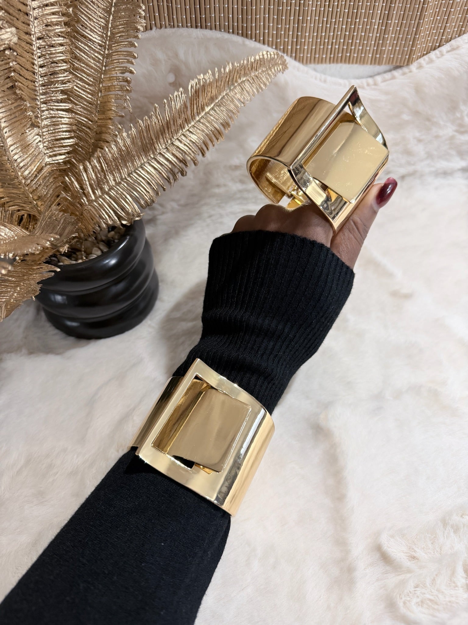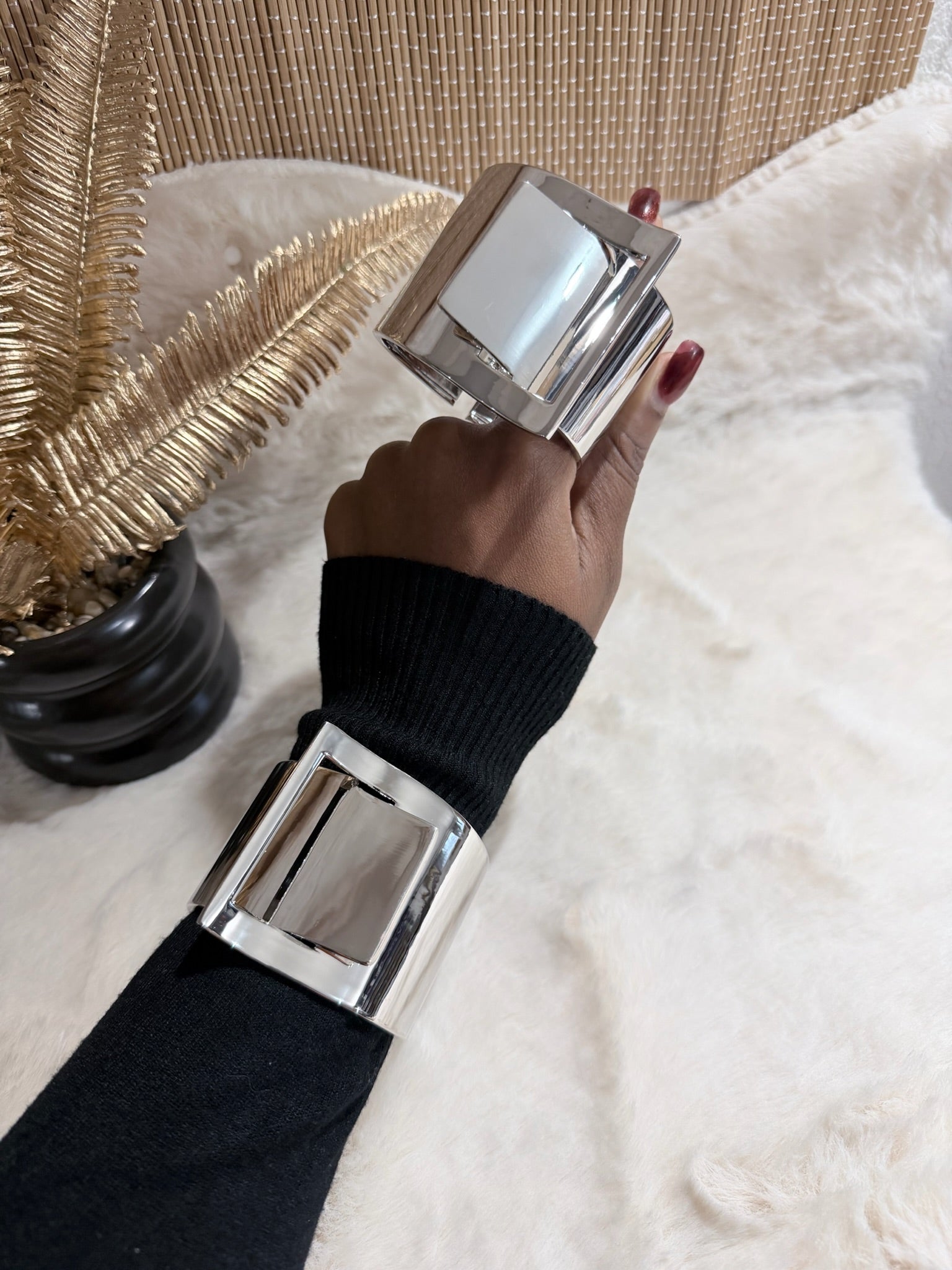 Un bracelet manchette moderne, sculpté avec caractère, pour sublimer le poignet avec une touche affirmée et sophistiquée.